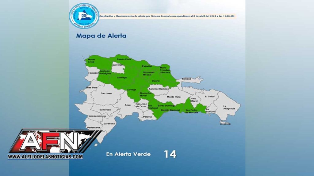 SANTO DOMINGO.- El Centro de Operaciones de Emergencias (COE) amplío el nivel de alerta verde para 13 provincias y el Distrito Nacional por la incidencia de un sistema frontal localizado al noreste del país.