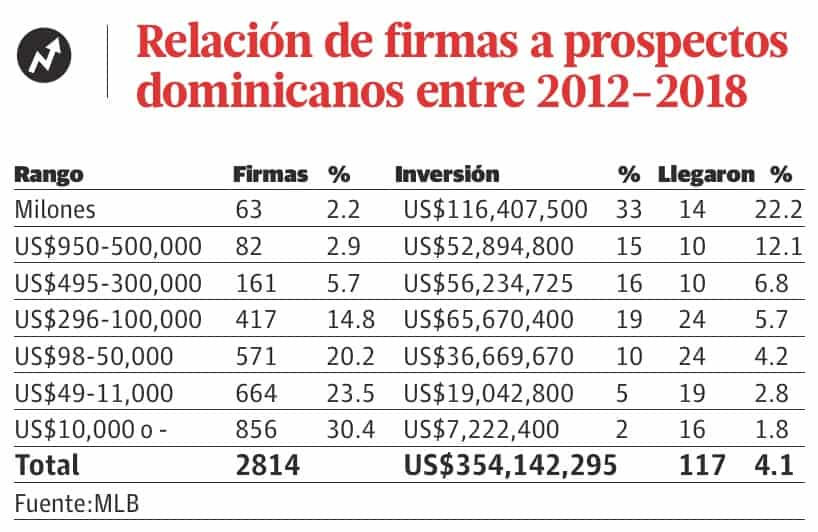 Es decir, los que firmaron por bonos de siete dígitos alcanzaron el objetivo original de toda firma 12 veces más que aquellos del segmento menos lucrativos. De ahí que los top prospects se llevaron el 33% del dinero contra el 2% de los más “humildes”.