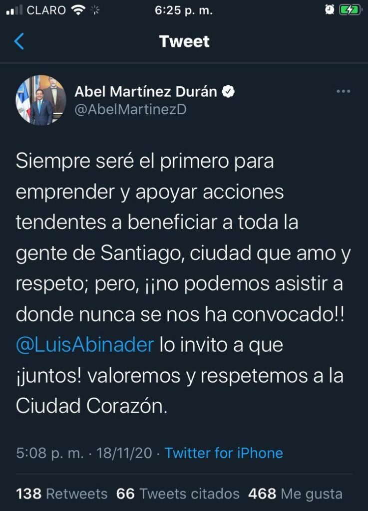 SANTIAGO. – El alcalde de Santiago, Abel Martínez, aseguró este miércoles en redes sociales que no fue invitado a la reunión que sostuvieron los ediles de esa provincia con el presidente de la República, Luis Abinader.