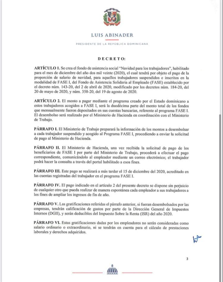 SANTO DOMINGO. – El presidente de la República, Luis Abinader, creó este viernes mediante decreto el fondo de asistencia social “Navidad para los trabajadores”, habilitado para el mes de diciembre del año dos mil veinte (2020), el cual tendrá por objeto el pago de la proporción de salario de Navidad, para aquellos trabajadores suspendidos e inscritos en la modalidad de FASE I.