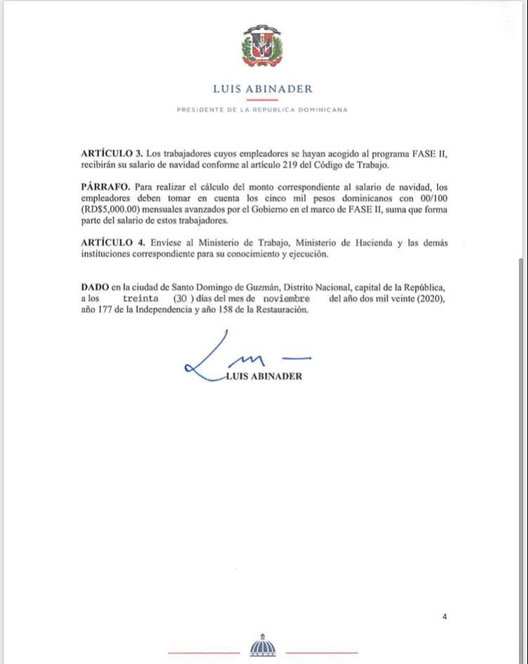 La medida presidencial concluye diciendo que, para realizar el cálculo del monto correspondiente al salario de navidad, los empleadores deben tomar en cuenta los cinco mil pesos dominicanos con 00/100 {RD$5,000.00) mensuales avanzados por el Gobierno en el marco de FASE II, suma que forma parte del salario de estos trabajadores.