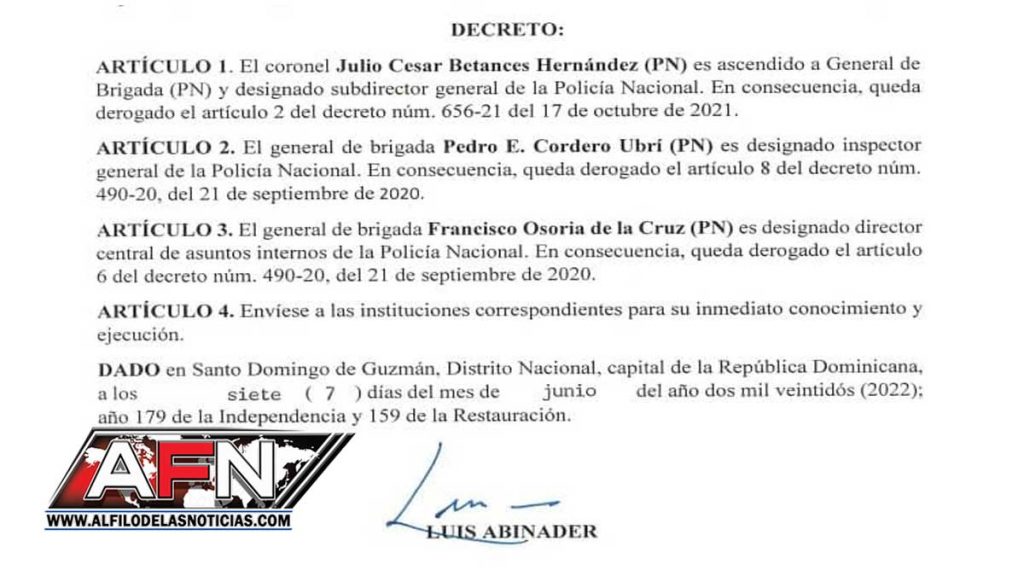 El presidente Luis Abinader designó a Julio César Betances Hernández como subdirector general de la uniformada y al general Pedro Cordero Ubrí como inspector general.