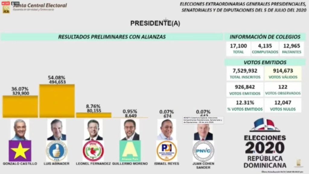 Santo Domingo.-El candidato presidencial del Partido Revolucionario Moderno (PRM), Luis Abinader, ha obtenido el 54,07 % de los votos en las elecciones presidenciales que se celebraron en la República Dominicana este domingo, según los primeros resultados preliminares oficiales.
