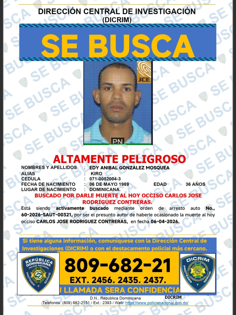 De acuerdo con las autoridades, mediante una orden de arresto, buscan a Eddy Aníbal González Mosquea, a quien catalogan como una persona “altamente peligrosa”.