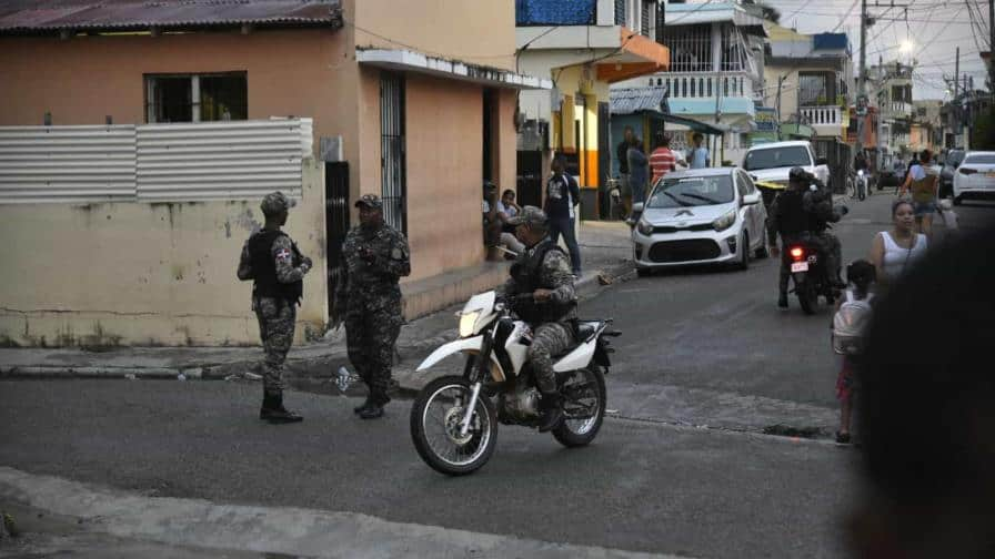 Dos camionetas del cuerpo del orden y casi una decena de agentes vigilan el lugar para evitar que los familiares de la víctima tomen alguna acción vengativa (DIARIO LIBRE/ KEVIN RIVAS)