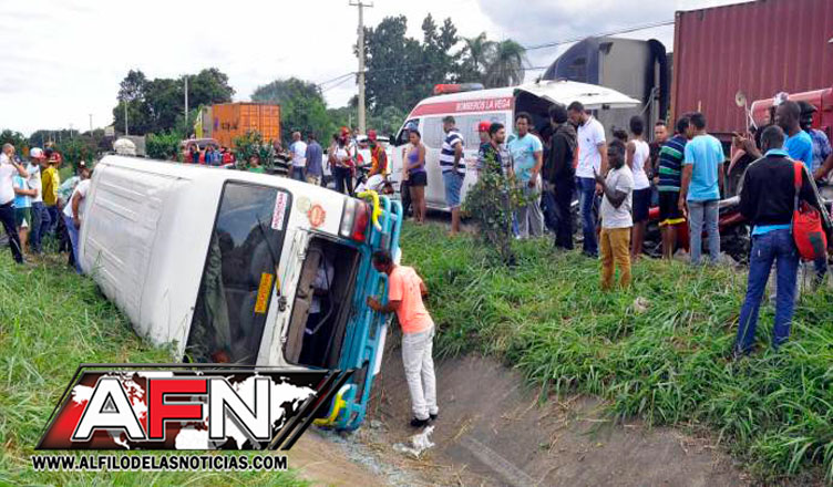 SANTO DOMINGO. Al menos cuatro personas resultaron heridas tras la volcadura de un autobús que previamente embistió a un haitiano que viajaba a bordo de una bicicleta la tarde de este domingo en la autopista Duarte, tramo Santiago-La Vega.