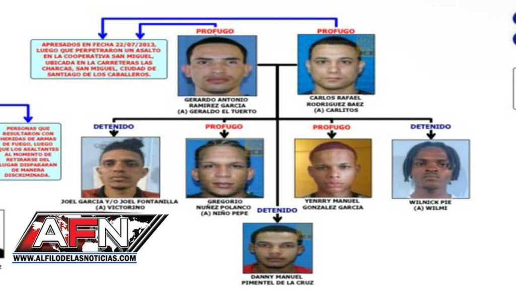 En conjunto con los tres ya en proceso, los implicados son Carlos Rafael Rodríguez Báez (Carlitos), Gregorio Núñez Polanco (Niño Pepe), Gerardo Antonio Ramírez García (el Tuerto) y Yenrry Manuel González García, estos dos últimos prófugos, además, Jairo de Jesús Estévez Rodríguez, un nuevo apresado, a quien se le vincula por presuntamente ser el conductor del vehículo donde se ocupó un fusil, y herramientas que posiblemente fueron utilizadas en el robo.