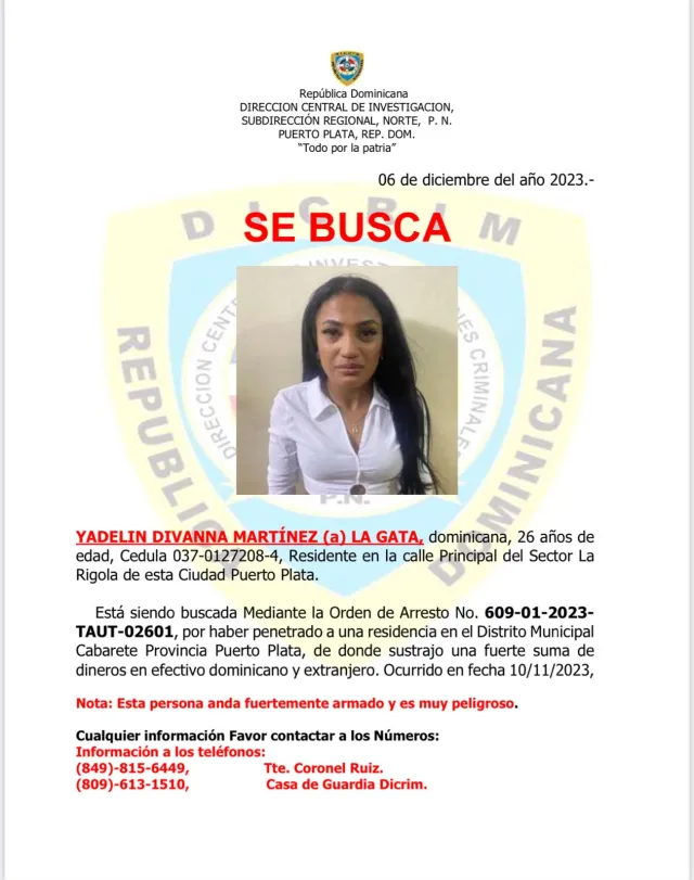 La referida dama era activamente buscada por las autoridades, ya que en noviembre un tribunal de Puerto Plata emitió contra ella la orden de arresto No. 609-01-2023-TAUT-02601 por la comisión de robo agravado en una residencia del distrito municipal de Cabarete.