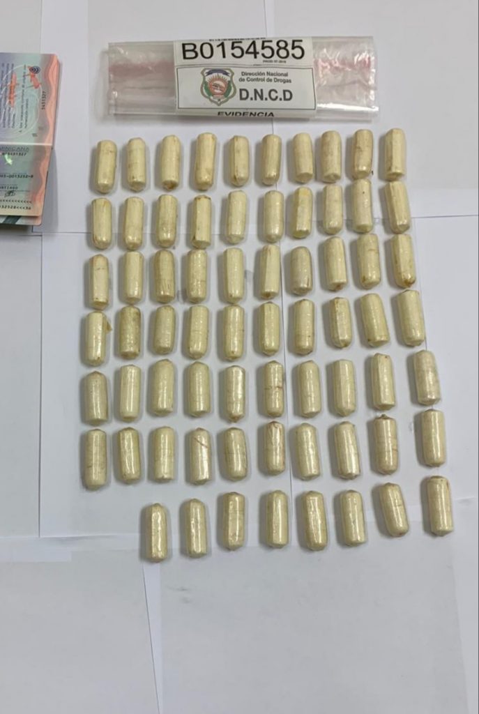 Agrega que el detenido fue sometido al proceso de expulsión de las 68 bolsitas en un centro de salud en Santiago, sustancia que tuvo un peso preliminar de 788 gramos presumiblemente cocaína.