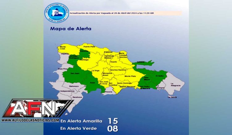 En ese sentido, 15 provincias se mantienen en alerta amarilla, entre estas, el Distrito Nacional, Santo Domingo, Santiago, La Vega, Monseñor Nouel, San José de Ocoa, Sánchez Ramírez y San Cristobal.