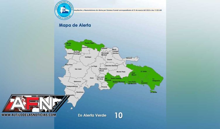 SANTO DOMINGO.- El Centro de Operaciones de Emergencias (COE) aumentó a 10 las provincias en alerta verde ante los aguaceros que se prevén para esta tarde y noche debido a la incidencia de un sistema frontal o frente frío, ubicado próximo a la costa norte.