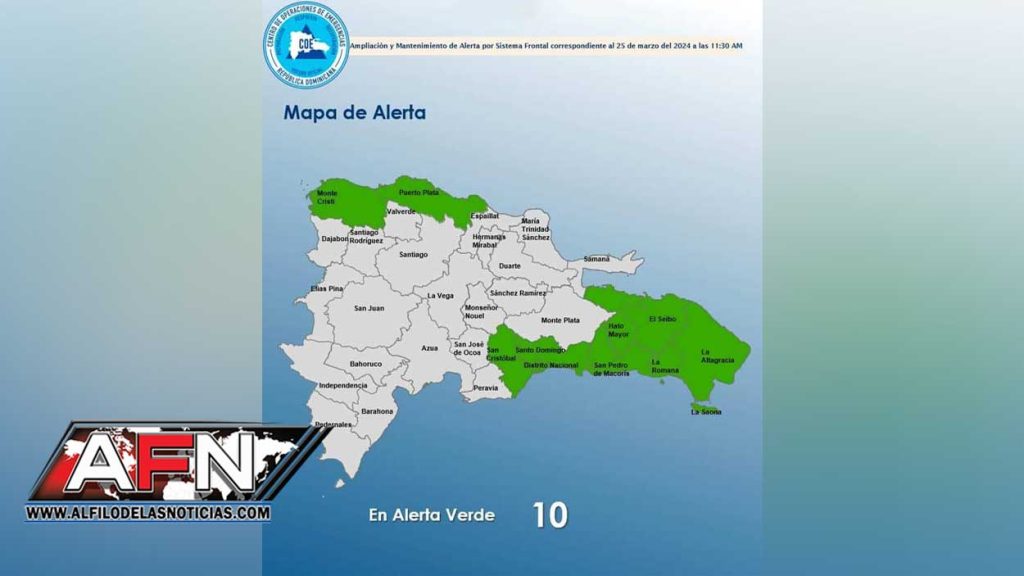 SANTO DOMINGO.- El Centro de Operaciones de Emergencias (COE) aumentó a 10 las provincias en alerta verde ante los aguaceros que se prevén para esta tarde y noche debido a la incidencia de un sistema frontal o frente frío, ubicado próximo a la costa norte.