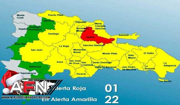 En alerta amarilla están el Distrito Nacional, Santo Domingo, Puerto Plata, María Trinidad Sánchez, La Altagracia, Hato Mayor, Monseñor Nouel, Espaillat, San Cristóbal, Samaná, Duarte, El Seibo, La Vega, Monte Plata, Santiago, San José de Ocoa, San Pedro de Macorís y San Juan.