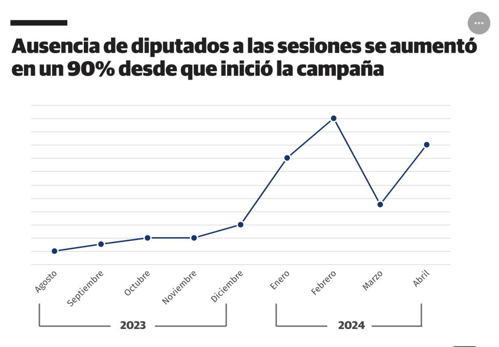De acuerdo con el Sistema de Información Legislativa de la Cámara de Diputados, desde agosto a noviembre del 2023, un promedio de 23 diputados se ausentó de las sesiones, mientras que desde diciembre (cuando inició la campaña municipal) hasta abril del 2024, la cantidad se aumentó a más del doble con un promedio de 34 diputados ausentes por cada sesión. La sumatoria registra un aumento de 91 % en el ausentismo de los congresistas.