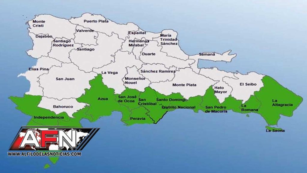 El COE colocó en alerta verde al Distrito Nacional, Santo Domingo, Peravia, Pedernales, Barahona, Independencia, Azua, La Altagracia, San Cristóbal, San José de Ocoa, San Pedro de Macorís y La Romana.