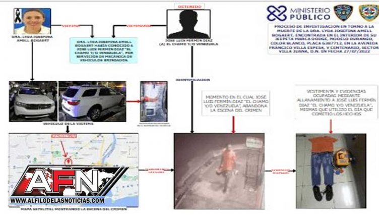 Han pasado 13 días desde que la odontóloga Lyda Josefina Amell Bogaert de Lalane fue encontrada muerta en el interior de su vehículo. Por el caso la Policía Nacional capturó a José Luis Fermín Díaz alias El Chamo y/o Venezuela, a quien imputó de haber cometido el crimen el 27 de julio pasado. La dama supuestamente había salido con él desde la tarde de ese miércoles y en la noche la mató en el vehículo de su propiedad en el cual se desplazaban, sin que se conozca hasta el momento el móvil del crimen.
