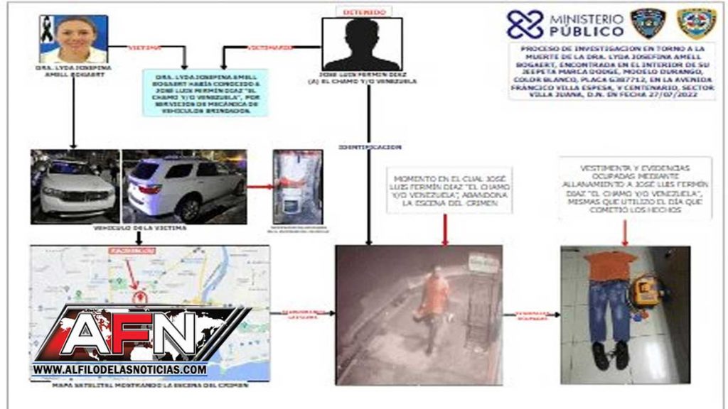 Han pasado 13 días desde que la odontóloga Lyda Josefina Amell Bogaert de Lalane fue encontrada muerta en el interior de su vehículo. Por el caso la Policía Nacional capturó a José Luis Fermín Díaz alias El Chamo y/o Venezuela, a quien imputó de haber cometido el crimen el 27 de julio pasado. La dama supuestamente había salido con él desde la tarde de ese miércoles y en la noche la mató en el vehículo de su propiedad en el cual se desplazaban, sin que se conozca hasta el momento el móvil del crimen.