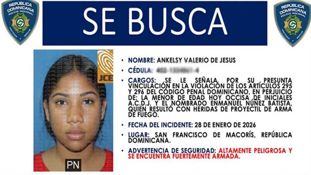 SAN FRANCISCO DE MACORÍS.– La Policía Nacional mantiene activa la localización de Ankelsy Valerio de Jesús, quien es señalada como la presunta autora de un hecho violento en el que perdió la vida su hermana menor, Aneisy Ceballos de Jesús, de 14 años, y resultó herido su cuñado, Enmanuel Núñez Batista.