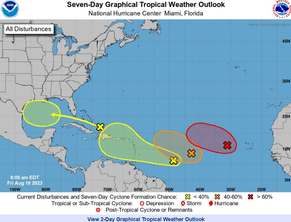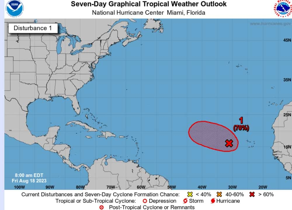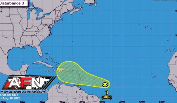 «Una vaguada alargada de baja presión ubicada aproximadamente a medio camino entre las islas de Cabo Verde y las Antillas Menores está produciendo algunas lluvias y tormentas eléctricas desorganizadas», indica el Centro Nacional de Huracanes.