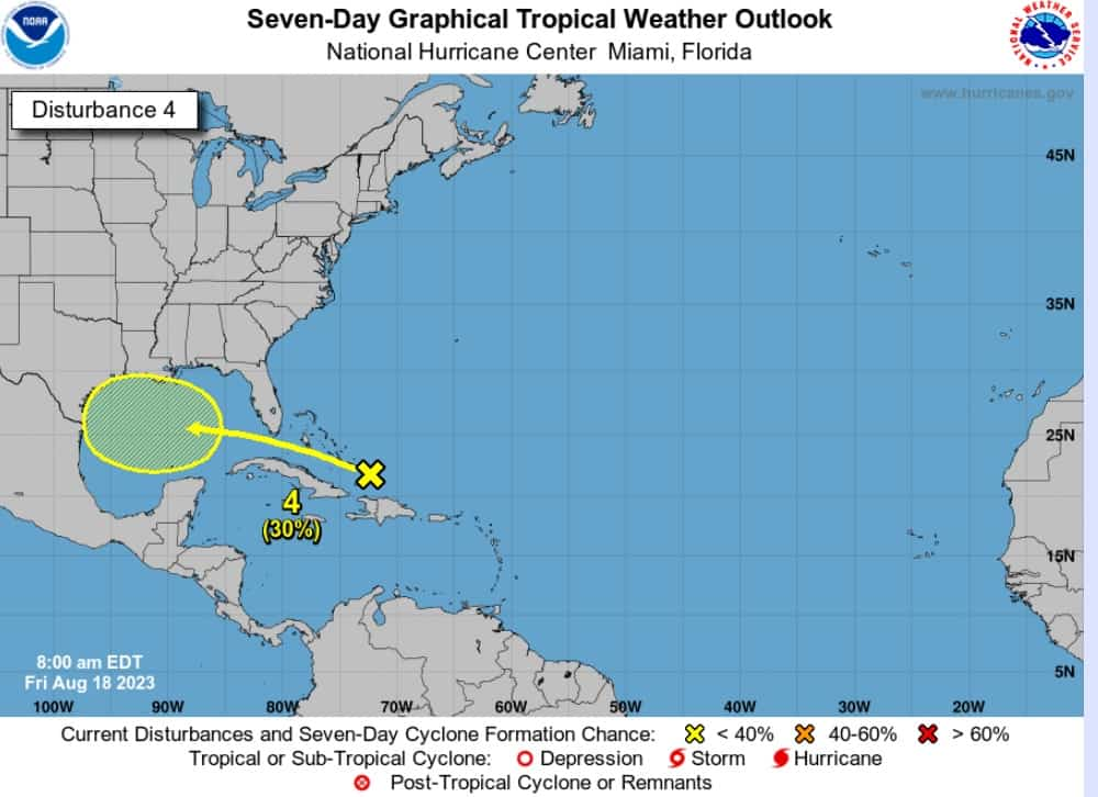 El Centro Nacional de Huracanes de Estados Unidos pronostica que esta área de clima ubicada justo al norte de la isla Hispaniola se trasladará al Golfo de México a principios de la próxima semana, donde se podría formar una amplia área de baja presión.