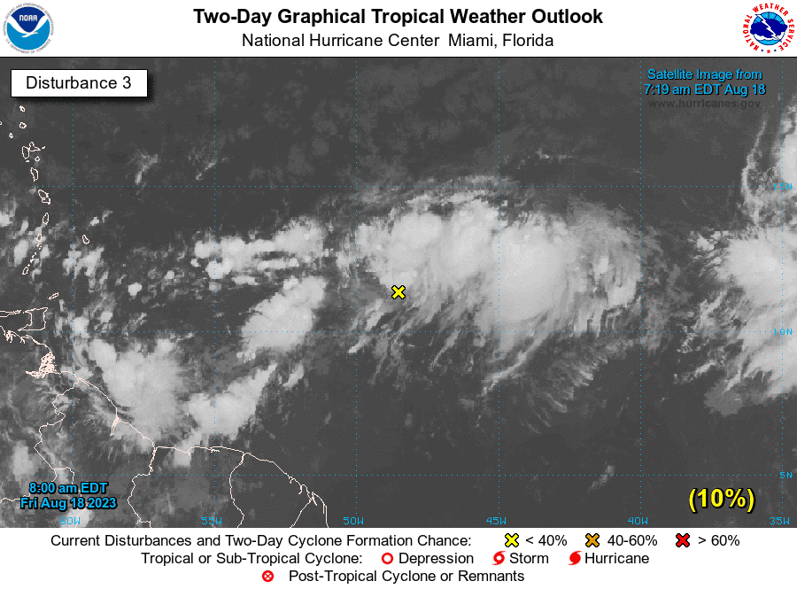 Manifestó que las condiciones ambientales son solo marginalmente propicias para un mayor desarrollo de este sistema, pero aún podría formarse una depresión tropical durante los próximos días mientras se mueve hacia el oeste-noroeste a una velocidad de 16 a 24 kilómetros por hora a través del Atlántico tropical central. A partir de entonces, se prevé que los vientos en los niveles superiores se vuelvan desfavorables para cualquier desarrollo posterior», señala.