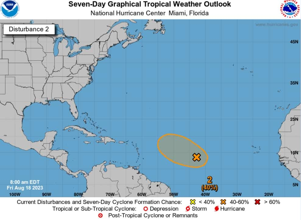 Otro sistema se ubica en el Atlántico tropical central y tiene un 40% de probabilidad de formación de ciclones en 48 horas.
