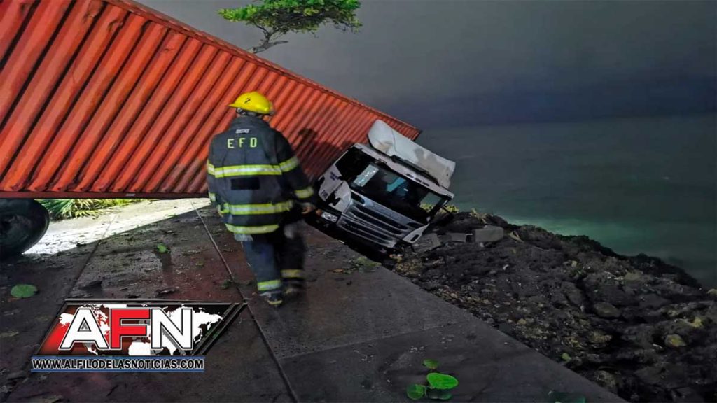 El camión no llegó a caer en el mar y quedó en el arrecife con tres neumáticos destruidos y despedazado el tanque de combustible.