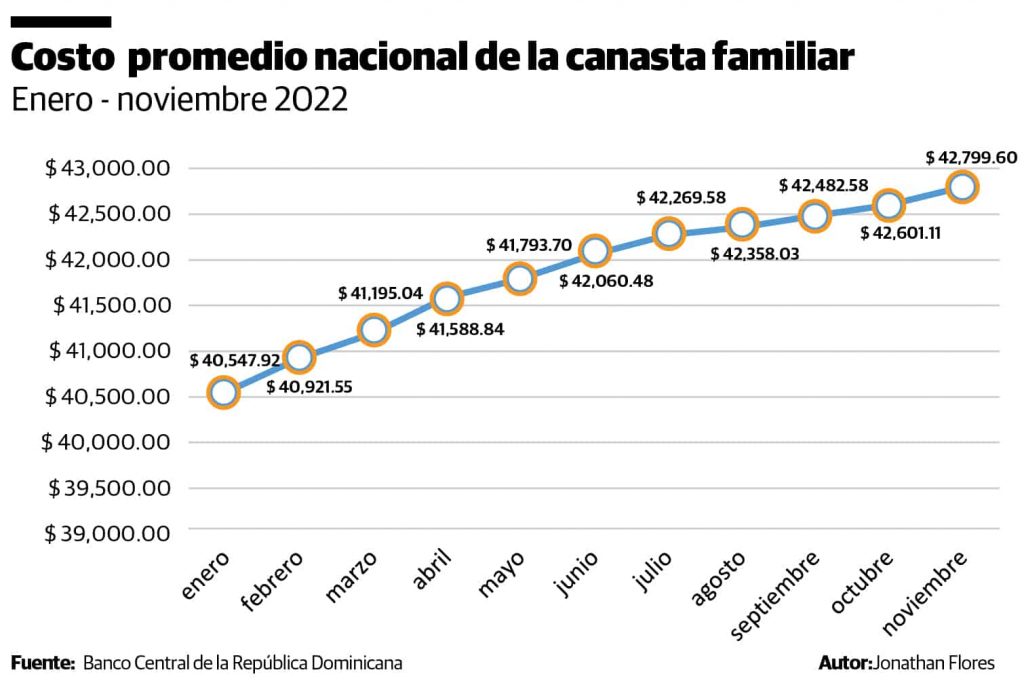 SANTO DOMINGO.- El costo promedio de la canasta familiar nacional en la República Dominicana terminará el presente año sobre los 2,250 pesos más cara que cuando comenzó el 2022, y las familias de menos ingresos son las que concluirían con el incremento porcentual mayor.