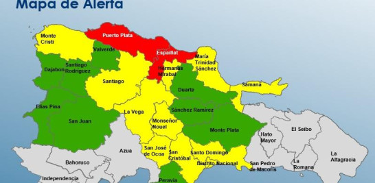 En alerta verde se encuentran las provincias San Juan, Elías Piña, Duarte (en especial el Bajo Yuna), Valverde, Santiago Rodríguez, Dajabón, Monte Plata, Peravia y Sánchez Ramírez.