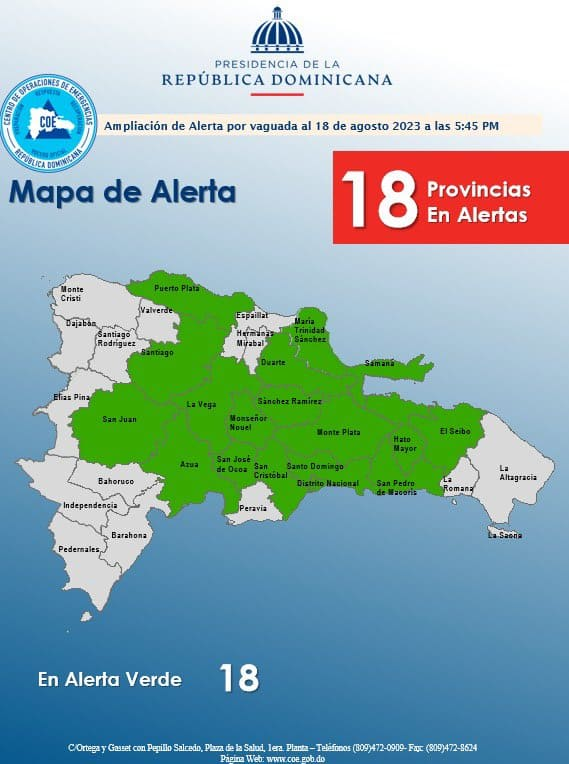 SANTO DOMINGO.- El Centro de Operaciones de Emergencias (COE) incrementó el número de provincias en alerta verde por los efectos de una vaguada sobre el país. Ahora son 18.