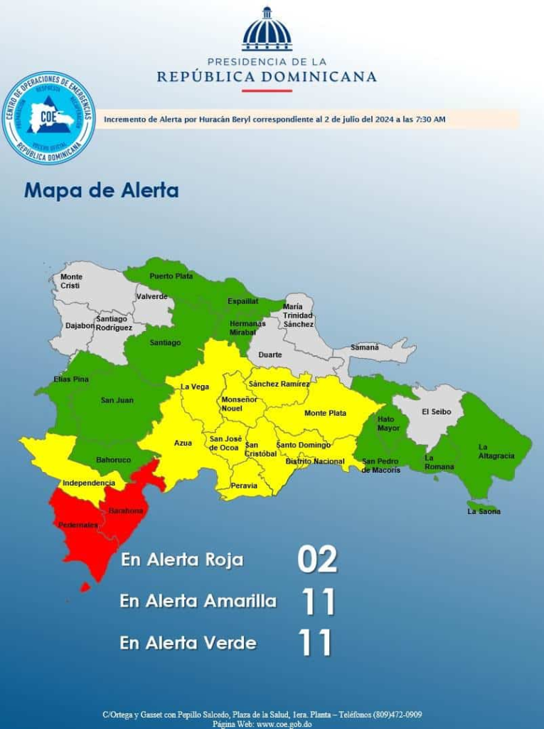 SANTO DOMINGO.- El Centro de Operaciones de Emergencias (COE) incrementó este martes a 24 el total de provincias bajo alerta ante los posibles efectos del huracán Beryl sobre la República Dominicana.