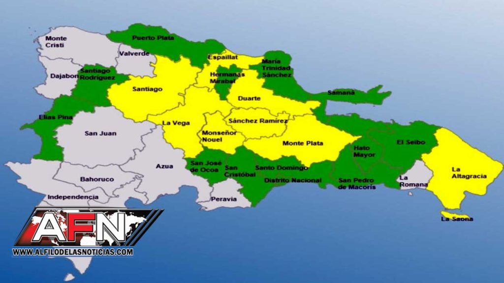En tanto que en verde están Santo Domingo, Distrito Nacional, San Pedro de Macorís, María Trinidad Sánchez, Elías Piña, San Cristóbal, Samaná, Hermanas Mirabal, Hato Mayor, Santiago Rodríguez, El Seibo, Puerto Plata y San José de Ocoa.