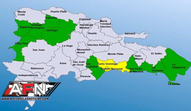 Asimismo, dos provincias se encuentran en alerta amarilla, las cuales son; el Distrito Nacional, y Santo Domingo.