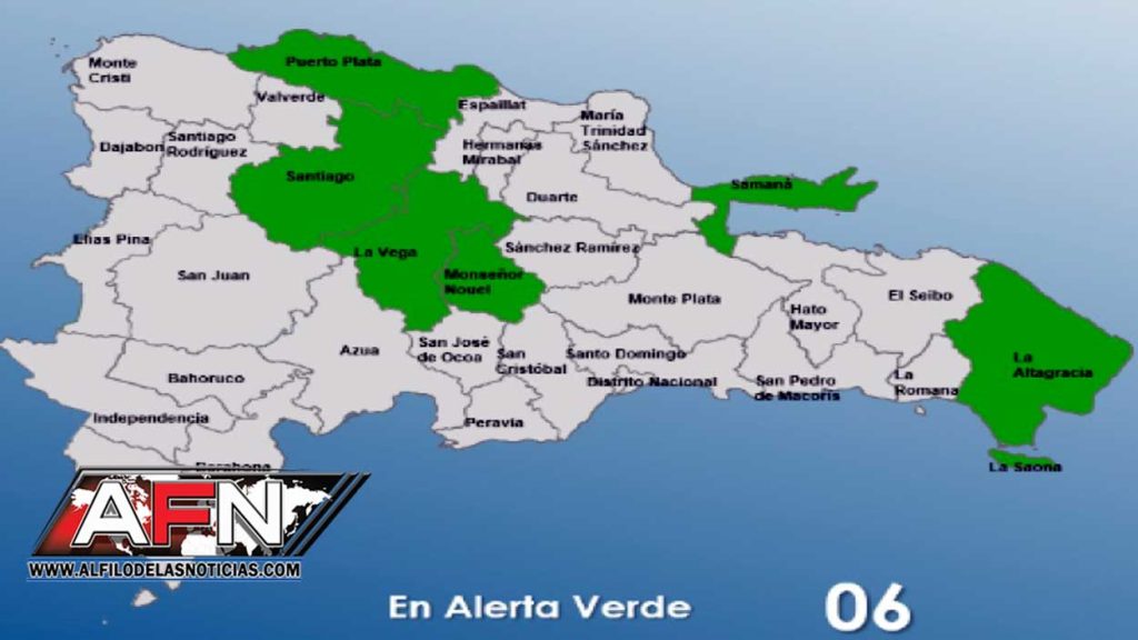 Santiago, Monseñor Nouel, La Vega, Puerto Plata, La Altagracia y Samaná fueron puestas bajo el nivel de alerta verde por posibles crecidas de ríos, arroyos y cañadas, así como inundaciones repentinas o urbanas.