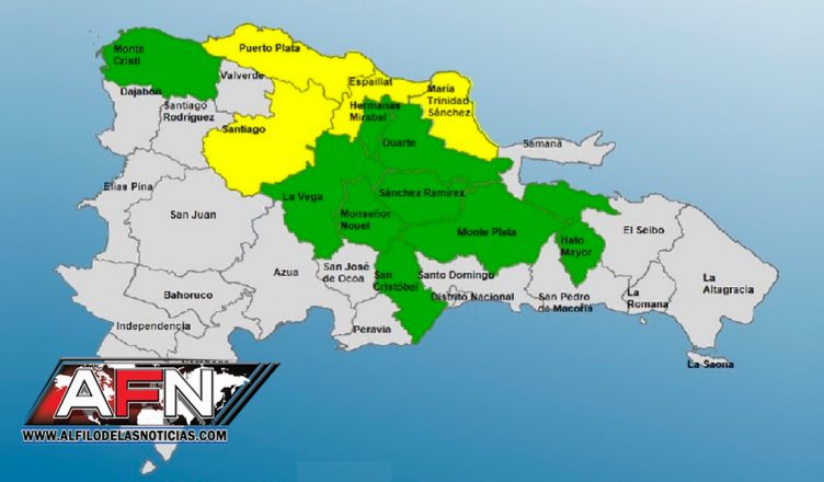Las provincias en alerta amarilla son, Montecristi, Espaillat, Puerto Plata, Valverde y Santiago y las que están en alerta verde son, Monte Plata, María Trinidad Sánchez, Duarte, Sánchez Ramírez, Samaná, Hermanas Mirabal, La Vega, Monseñor Nouel, Santiago Rodríguez y Dajabón.
