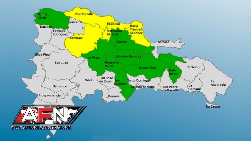Las provincias en alerta amarilla son, Montecristi, Espaillat, Puerto Plata, Valverde y Santiago y las que están en alerta verde son, Monte Plata, María Trinidad Sánchez, Duarte, Sánchez Ramírez, Samaná, Hermanas Mirabal, La Vega, Monseñor Nouel, Santiago Rodríguez y Dajabón.