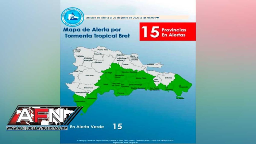 SANTO DOMINGO.- El Centro de Operaciones de Emergencias (COE) puso en alerta verde a 15 provincias ubicadas sobre todo en el litoral costero Caribeño, el Nordeste, Cordillera Central y la zona fronteriza del país ante el paso de la tormenta Tropical Bret.