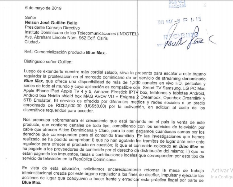 SANTO DOMINGO.- Las compañías telefónicas Claro y Altice mostraron este vienes su preocupación al Instituto Dominicano de las Telecomunicaciones (INDOTEL) sobre la proliferación en el mercado dominicano de un servicio de streaming denominado Blue Max, el cual ofrece más de 1,200 canales en vivo HD y películas y series de todo el mundo.