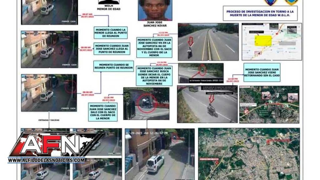 La evidencia compartida por la policía muestra que ese mismo día, a las 8:07 de la mañana, la niña llegó al punto de reunión, cercano a la residencia, y un minuto más tarde llegó Sánchez Nivar y se encontró con ella. De acuerdo con las investigaciones, el hombre, de 37 años, secuestró a Willeni utilizando una motocicleta de su propiedad.
