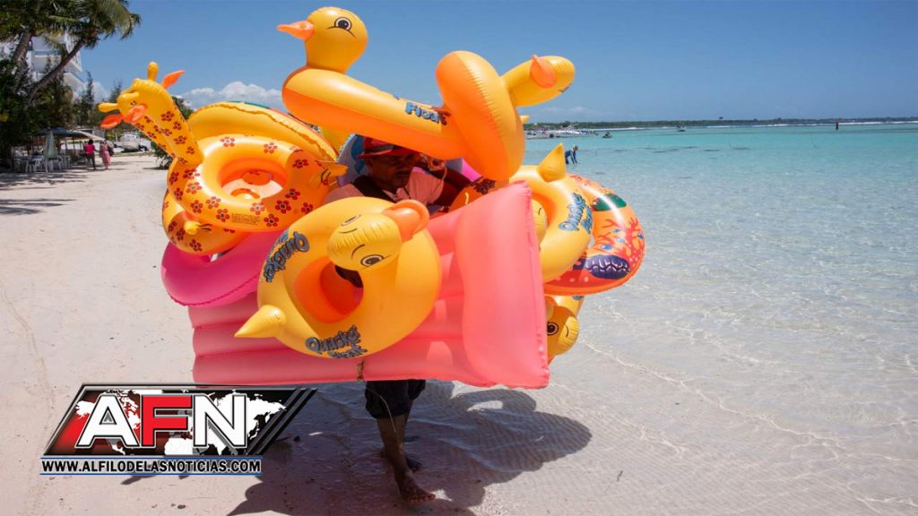 Mario Díaz es vendedor ambulante de cubitos y palas plásticas para que los niños jueguen en la arena y gafas protectoras de agua. Ambas cosas las vende a 200 pesos.