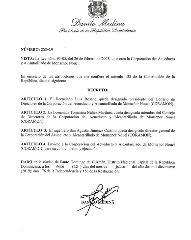 SANTO DOMINGO.- El presidente Danilo Medina designó a San Agustín Jiménez Castillo y a Luis Rosado, director general y presidente del Consejo de Directores de la Corporación del Acueducto y Alcantarillado de Monseñor Nouel (CORAMON), respectivamente.