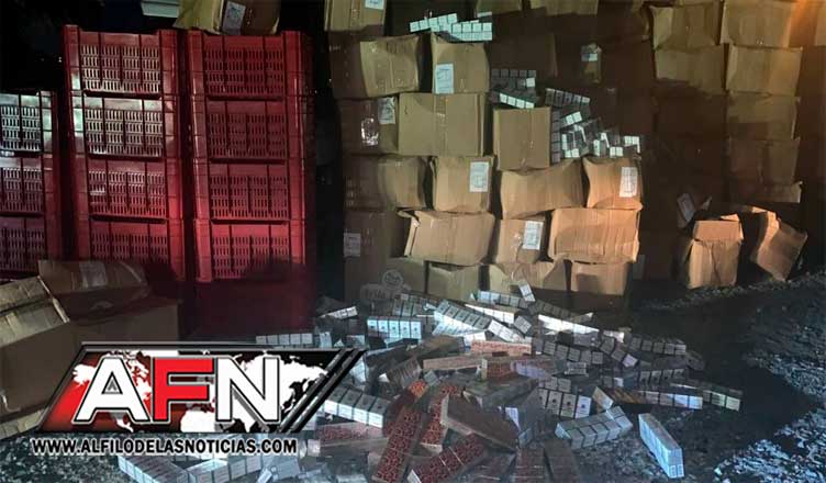Además, fueron incautados tres cajas de cigarrillos, marca Fency, conteniendo en su interior un total de 30,000 unidades, así como 225 canastos, color rojo, conteniendo lechosas, y un celular.