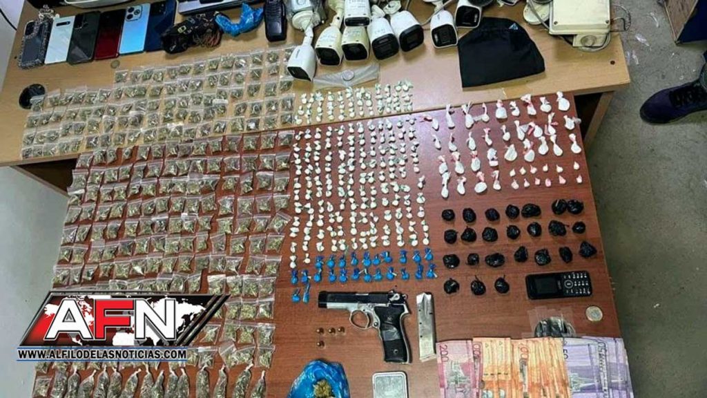 Durante la operación, que incluyó cinco allanamientos simultáneos, las autoridades decomisaron una pistola calibre 9mm sin documentación, 297 porciones de marihuana, 212 de cocaína, y una de crack, junto con una balanza y una máquina tragamonedas.