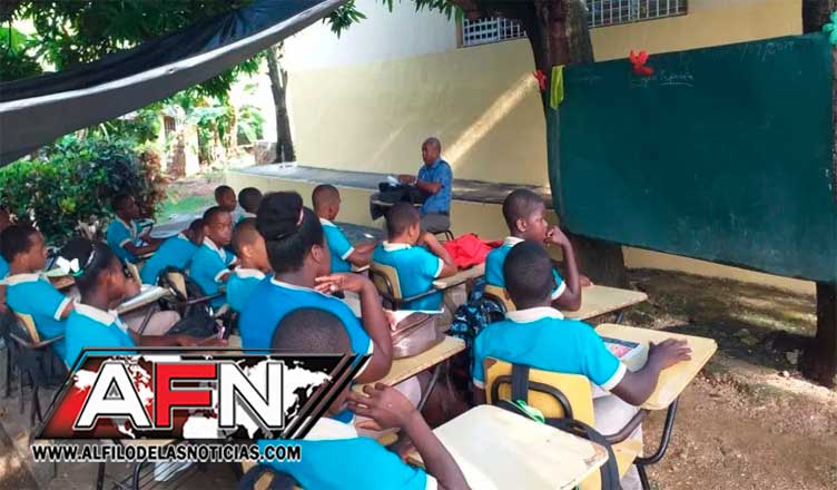 “Las butacas han sido colocadas en el piso de tierra donde funciona el aula improvisada, debajo de dos matas de mango a sol y lluvia , la cual es cobijada por una lona oscura que es sostenida por una cuerda que bordea los dos árboles; así como parte de la maya ciclónica de la verja perimetral, ubicada al frente de la calle que pasa por la parte frontal de la escuela”, explicó.