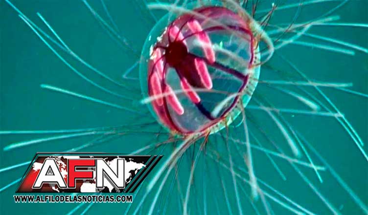 Este espécimen, del género “Crossota” y denominado “psicodélico” por los científicos, tiene tentáculos cortos y largos alrededor de toda la parte central, una especie de campana o cúpula semitransparente con un interior rosáceo.