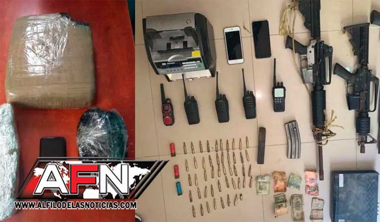 También se ocuparon 47 capsulas 5.56 mm, 22 celulares, 19 plantas de marihuana, 7 motocicletas, seis balanzas, seis radio de comunicación, dos fusiles, dos cargadores de fusil, una maquina traga moneda y una escopeta.