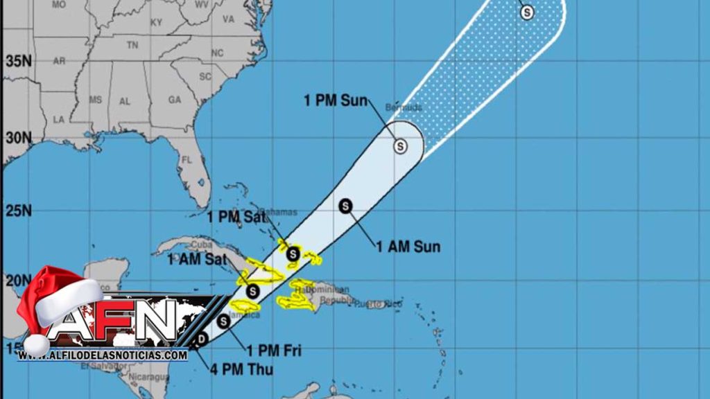 «Se pronostica que la perturbación sobre el Mar Caribe centro-occidental se convertirá en tormenta tropical. Alertas de tormenta tropical emitidas para partes de las Antillas Mayores, el sureste de las Bahamas y las Islas Turcas y Caicos», comunicó.