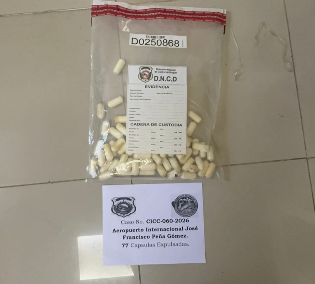 Añaden que, junto a miembros del Cuerpo Especializado de Seguridad Aeroportuaria, (Cesac) e inspectores de Aduanas (DGA), apoyados por el Ministerio Público, y en presencia de un fiscal, el imputado fue trasladado a un centro de salud, donde fue sometido a una radiografía, arrojando positivo a sustancias controladas, iniciando de inmediato el proceso de expulsión de las bolsitas.