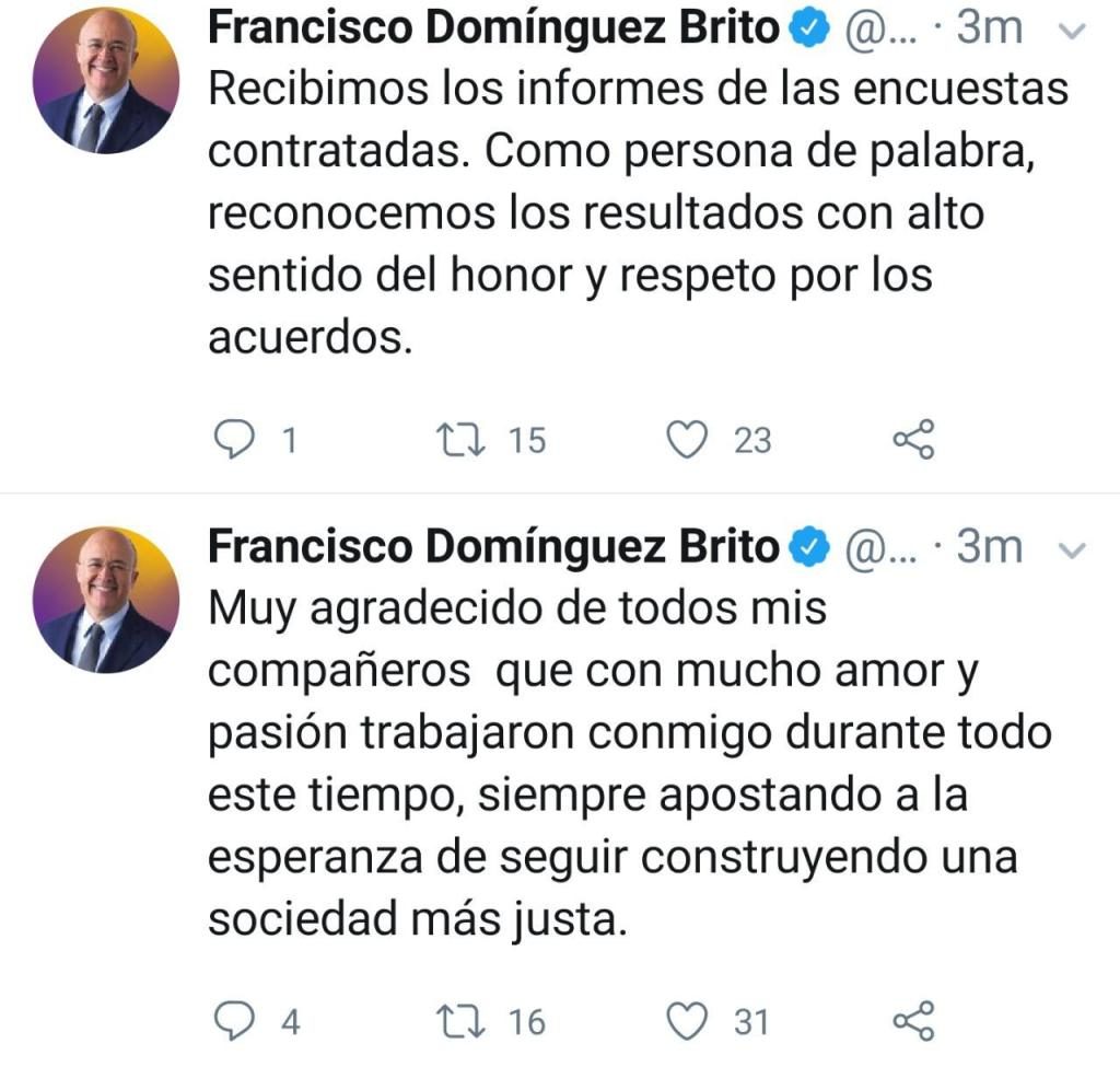 Mediante varios posteos en su cuenta de twitter, Domínguez Brito agradeció a todos los compañeros que mostraron su apoyo por su candidatura presidencial.