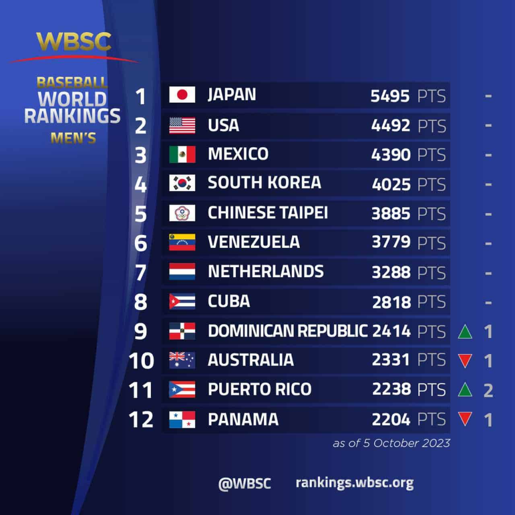 El número uno del mundo Japón (5.495) aumentó su diferencia sobre el segundo, Estados Unidos (4.492) en la cima de la clasificación después de ganar su primera Copa Mundial de Béisbol Sub-18 WBSC en septiembre pasado.